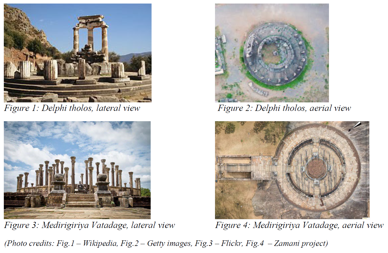 To begin with, the images below depict the lateral and aerial views of the Delphi tholos in Greece and the Medirigiriya Vatadage in Sri Lanka. The similarities and differences are further analyzed in later sections.